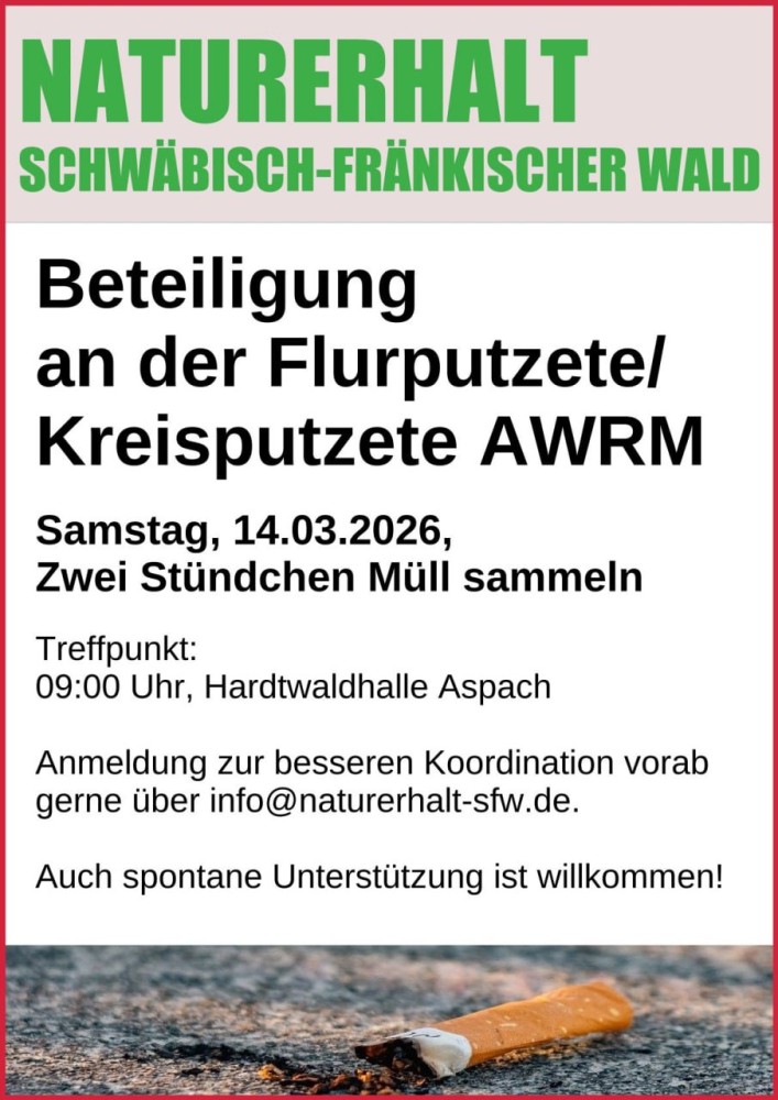 Am Samstag, den 14.03.2026, nimmt der Naturerhalt Schwäbisch-Fränkischer Wald e.V. an der Kreisputzete teil. Wer für zwei Stunden Natur und Landschaft von Müll befreien möchte, ist herzlich eingeladen, mitzumachen! Eine rechtzeitige Anmeldung wäre für die Beschaffung der Arbeitsmaterialien hilfreich, wir freuen uns aber auch über jeden spontanen Unterstützer. Für eine bessere Koordination des Einsatzes ist vorab eine Anmeldung beim Verein Naturerhalt Schwäbisch-Fränkischer Wald möglich über info@naturerhalt-sfw.de. Der Verein plant, die Kreisputzete sowohl in Aspach als auch Oppenweiler zu unterstützen.
